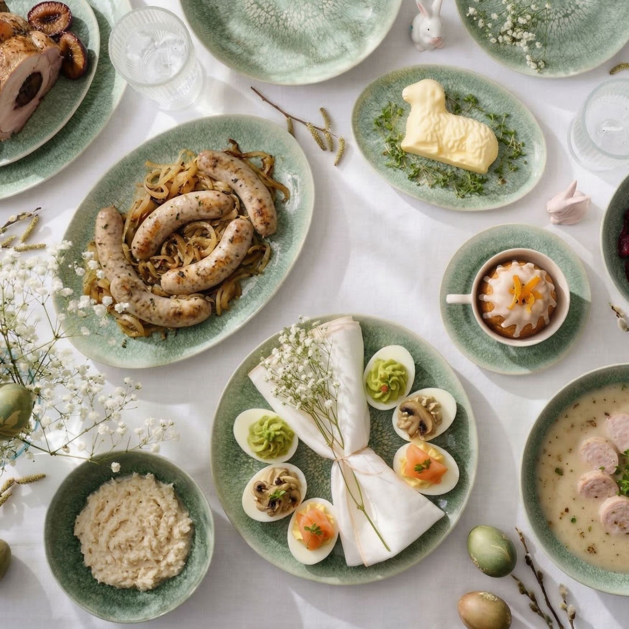 Na stół wielkanocny warto podać tradycyjne potrawy, takie jak: jajka w różnych postaciach, żurek, biała kiełbasa, mazurek, baba wielkanocna, sałatka jarzynowa, pasztet, śledzie, wędliny i chleb.