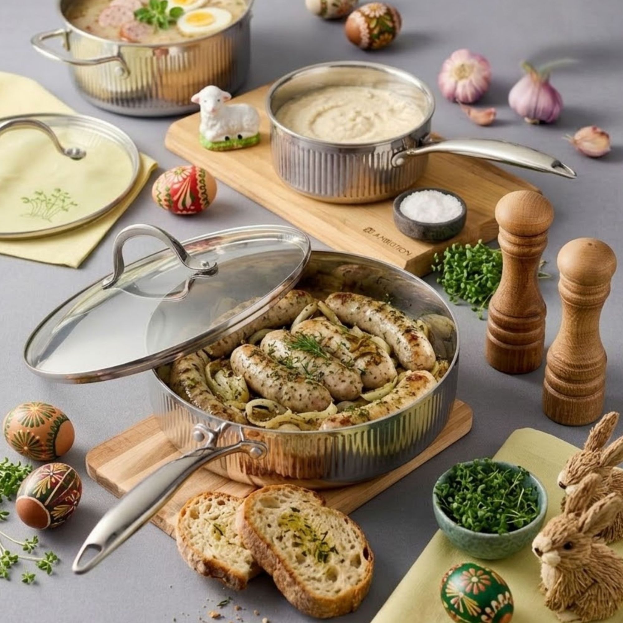 Wielkanoc to czas, w którym spotykamy się przy rodzinnym stole, ciesząc się wyjątkowymi potrawami. Potrawy wielkanocne łączą tradycje z nowoczesnością, a każde danie ma swoje znaczenie i symbolikę. W tym artykule znajdziesz inspiracje na dania na Wielkanoc, zarówno te klasyczne, jak i nowoczesne. Dowiesz się również, jakie akcesoria kuchenne, jak garnki, patelnie, formy do pieczenia czy naczynia z podgrzewaczem, pomogą Ci w przygotowaniu idealnych świąt.